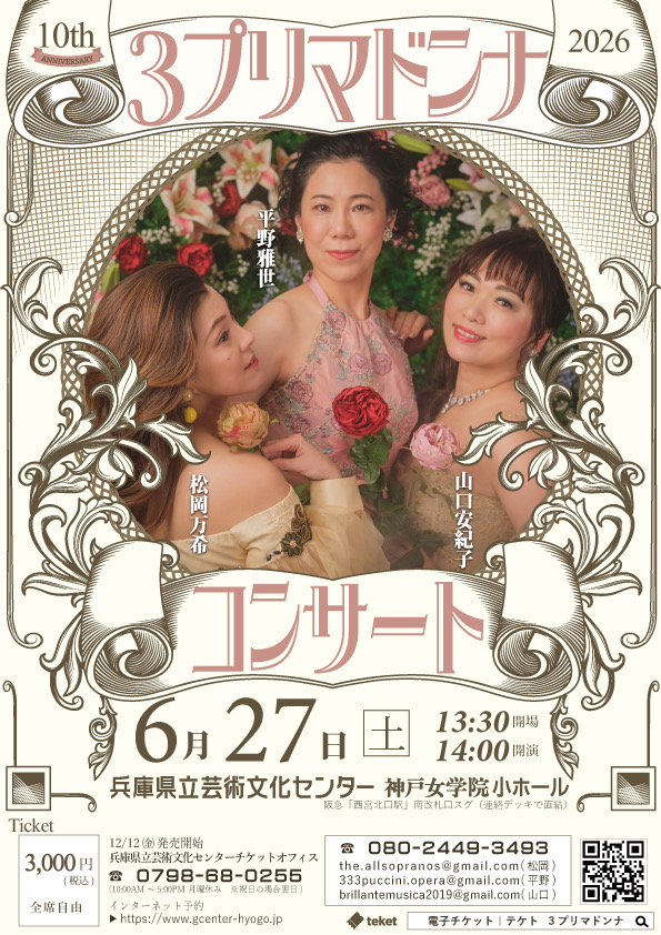 お問合せ: ・兵庫県立芸術文化センターチケットオフィス:0798-68-0255 ・3プリマドンナコンサート事務局:080−1493−7522